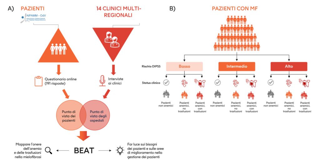 Figura 1. A) Il progetto BEAT ha raccolto il punto di vista di 191 pazienti e 14 clinici esperti della patologia, per poter determinare l’impatto dell’anemia e delle trasfusioni sulla vita dei pazienti e sul Sistema Sanitario Nazionale. B) I pazienti sono stati suddivisi in vari gruppi, in base al rischio DIPSS della mielofibrosi e al loro stato clinico. Questo è servito a confrontare come il peso dell’anemia e delle trasfusioni vari con il progredire della mielofibrosi e dell’anemia.